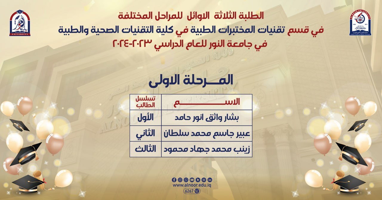 الحاصلون على المراتب الاولى والثانية والثالثة بين اقرانهم من طلبة المرحلة الاولى في اقسام كليات جامعة النور