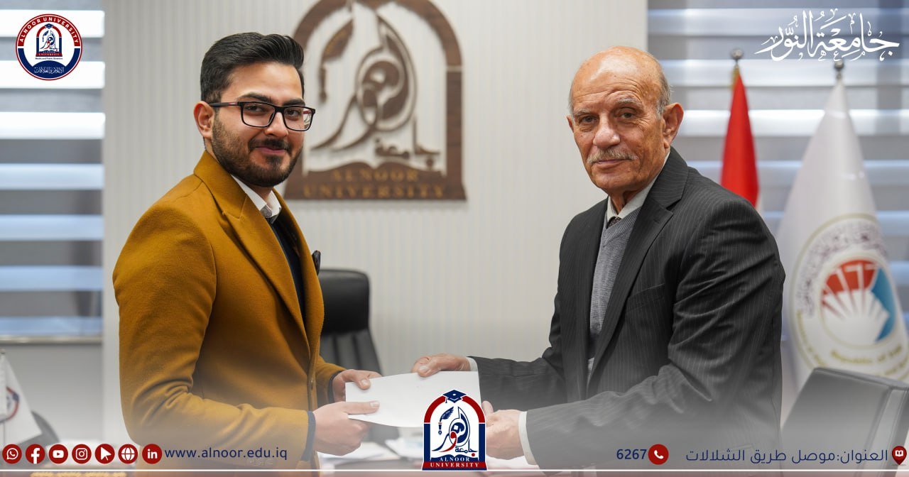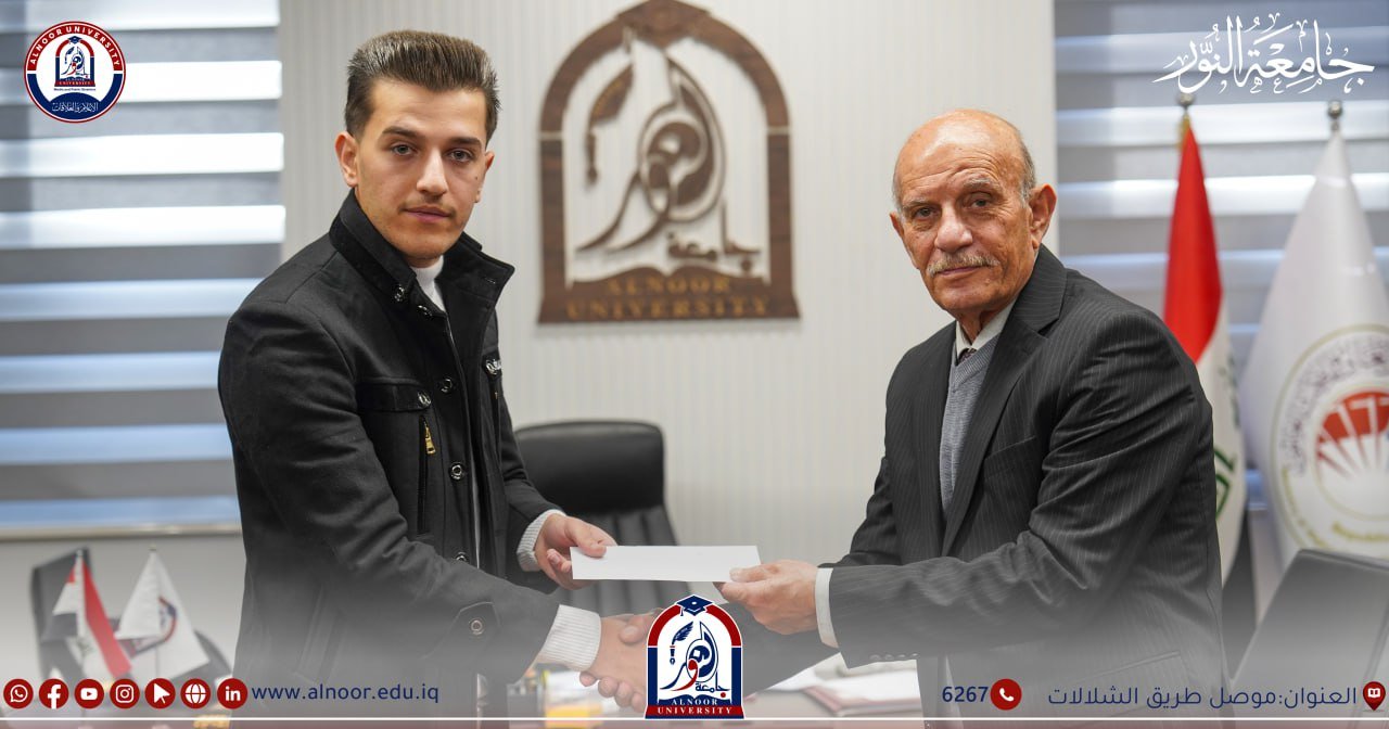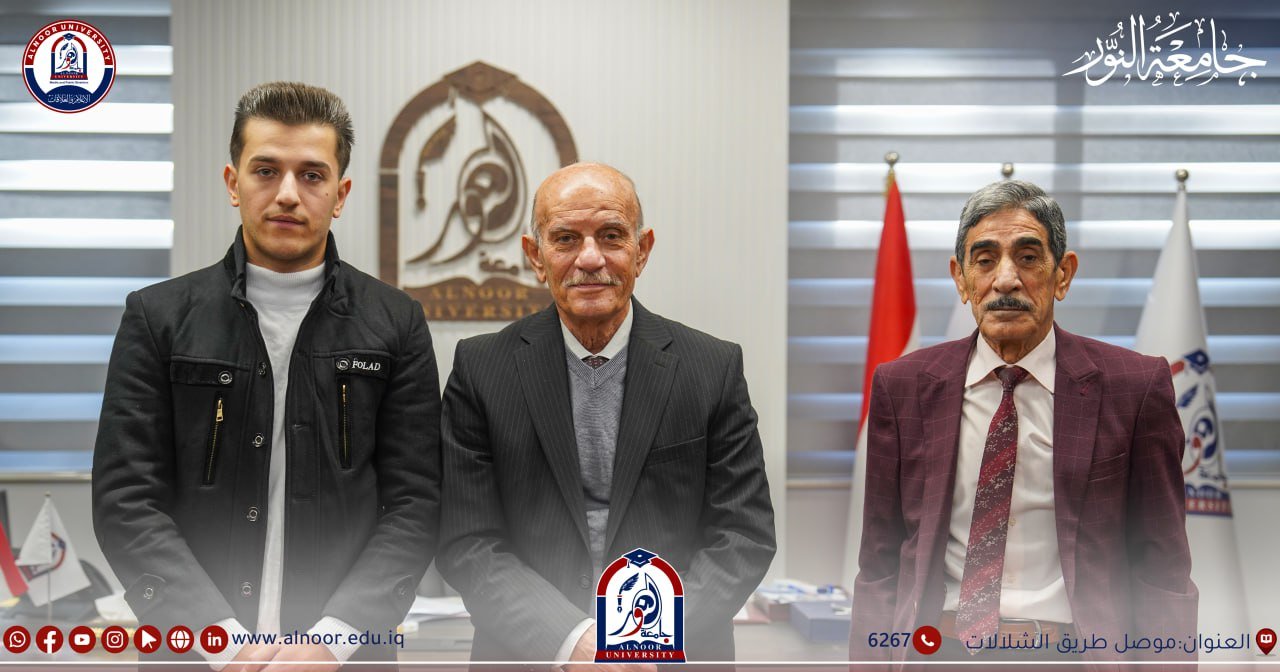 في اطار دعم الطاقات الطلابية المتفتحة على ضروب العلوم والمعارف،التقى الاستاذ الدكتور ياسين طه الحجار رئيس جامعة النور المتخرجين في قسم التقنيات الطبية في الجامعة سامح فلاح حسن وبكر امجد خليل